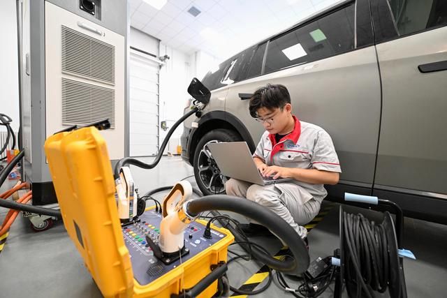 9月14日,在中汽中心新能源汽车科技创新基地充电技术部,工作人员测试某款新能源车型充电兼容性能。新华社记者 孙凡越 摄